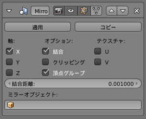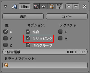 ミラー・モディファイアーのパネルにある「クリッピング(Clipping)」にチェックを入れます。これは選択した頂点を移動させても、ミラーで指定している軸(ミラーリングの基準となる中心軸)より反対側に頂点が行かないようにする機能です。メッシュの形状を変える操作のときは、チェックを入れておくと便利です。ただし、ミラー軸にクリップされてしまうので、ミラー軸上の頂点を動かしたいときは、「クリッピング」のチェックを外さないと動かすことができません。必要に応じて使い分けます。