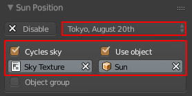 その下の「Cycles sky」のチェックを入れ、Sky Textureを指定します。また、その隣りの「Use object」にチェックを入れ、Sunランプを指定します。 これで背景とSunランプがこのアドオンにリンクされました。