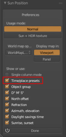 「Sun Position」パネルの「Disable」ボタンを押します。最初の表示に戻るので、レンチ柄のボタンを押します。「Normal」ボタンを押すと、図のように表示 が変わるので、「Time/place presets」にチェックを入れ、「Done」ボタンを押 します。
