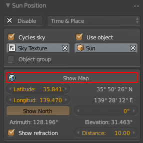 「Sun Position」パネルの「Show Map」ボタンを押します。