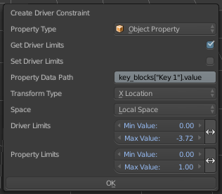 ⑤表示されたダイアログには、コピーしたデータパスが入力されているので、基本的にはボーンのどういった動きでコピーしたプロパティが動くのか(Transform Typeで)、ボーンの移動量に対するプロパティの変化量(最大/最小値)を設定(Property Limitsで)します。